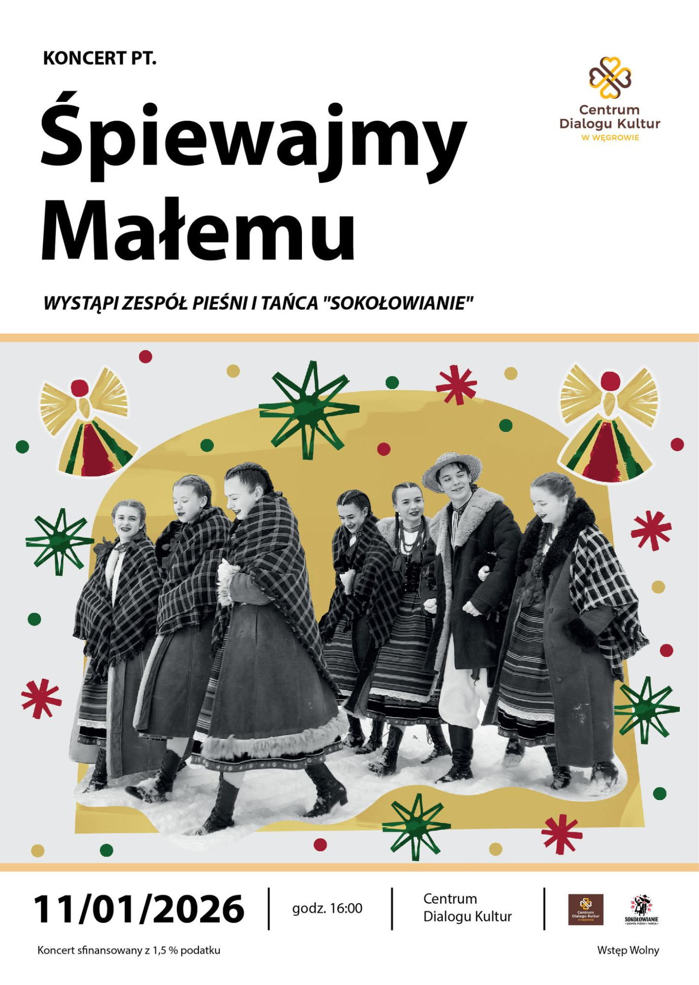 W najbliższą niedzielę, 11 stycznia o godz. 16.00, Centrum Dialogu Kultur zaprasza mieszkańców na koncert świąteczny pt. „Śpiewajmy Małemu”. Wydarzenie będzie okazją do wspólnego kolędowania oraz spotkania z bogatą tradycją polskiego Bożego Narodzenia.