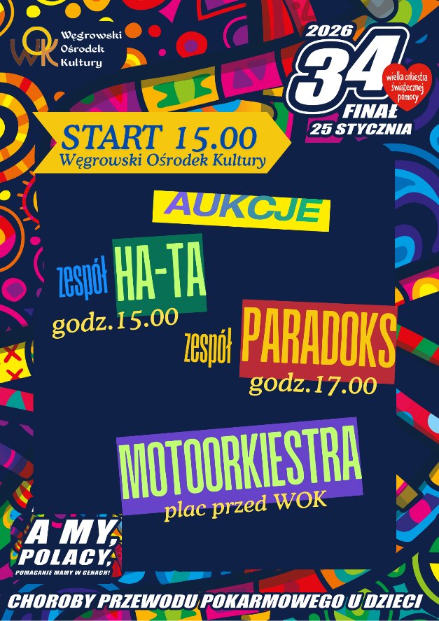 Także w Węgrowie finał WOŚP będzie miał bogaty program. Wydarzenia odbędą się 25 stycznia w Węgrowskim Ośrodku Kultury, gdzie od godziny 15.00 rozpoczną się aukcje - w tym tradycyjnie do wylicytowania będzie Dzień w Fotelu Burmistrza. Zaplanowana jest także część artystyczna. Na scenie wystąpi zespół HA-TA, a następnie zespół Paradoks. Dodatkową atrakcją będzie MotoOrkiestra, która pojawi się na placu przed WOK-iem w godz. 9-16. Całość, podobnie jak w Łochowie, połączona będzie ze zbiórką na rzecz tegorocznego celu finału.