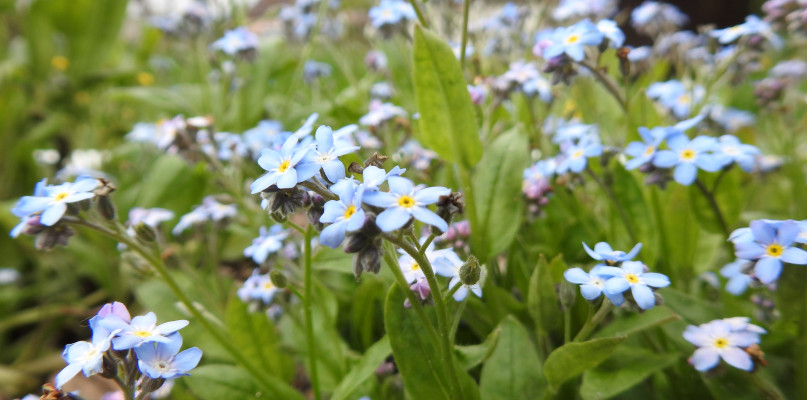 Maj jest również miesiącem niezapominajek. Błękitne jak niebo w pogodny dzień, delikatne, malutkie, mało widowiskowe w porównaniu z innymi kwiatami, mają w sobie jednak wiele uroku. Myślę nawet, że to właśnie te maleńkie kwiatki podarowane komuś kogo lubimy, kochamy bardziej zapadną w pamięć niż nawet dostojna róża.